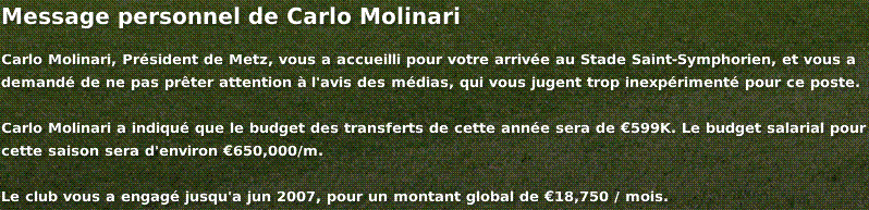 Première impression en arrivant au club : je ne suis pas bien acceuilli par les supporters. Normal, un austro-hongrois à Metz, cela ne s'est jamais vu. Mais un message du président m'attend :