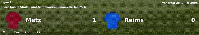 Aucun nouvel arrivant pour le moment donc les compositions reflètent des tests. L'espoir est d'être moins ridicule qu'au premier match. 1ere mi-temps : Voici venu, le temps, des rires et des lents.... Globalement, Metz domine(55% de possession). Mais hormis trois occasions de Cissé qui se sont terminées en drop, rien de très concret. A dominer stérilement, Metz s'expose aux contres et aux mauvaises relances. Sur une relance plein axe de Delhommeau, le milieu adverse trouve, dans le dos du déjà nommé Delhommeau, l'attaquant qui marque pepère.1-0 (33°). 2nde mi-temps : Domination stérile, quand je t'aime... En seconde mi-temps, les défenseurs messins se font plus présents dans le jeu (récupération plus haute de la balle), de nombreuses occasions mais hélas, les quatres pieds gauches de mes attaquants ne trouvent jamais la direction du but (hormis sur une tête). Bilan - Gardien : quelques parades intéressants de Delle (7) et de Degré (7) qui ont joué au même niveau. - Défenseur droit : bon match défensif de Béria (7)mais réussir des passes (60%, 3 intéressantes) serait une bonne option. Remplacé par C.Gueye (7) qui, s'il a su passer (75%), n'a pas démontrer grand chose - Défenseur gauche : Delgado (7) ne m'a pas convaincu (peu d'influence sur le match) et son remplaçant, Corrales (7) a apporté un plus défensivement et offensivement. - Défense centrale : Delhommeau a commis une erreur (encore ?) qui a amené le but. Kadvanski a été moins mauvais qu'au match précédent mais sans se montrer transcendant. Bassong n'a pas été mauvais mais n'a pas pesé dans le jeu. Diop s'est montré le plus adroit. La charnière Bassong-Diop risque fortement de commencer le championnat (mais j'ai le temps), Delhommeau sera sans doute remplaçant et Kadvanski avec l'équipe B. - Milieu centre : Stelletta n'a pas confirmé son bon match précédent tout comme Cardy avec qui il était associé. La paire François-Djiba qui a terminé le match s'est montré plus présente (30 ballons donné contre 50) - Ailiers : le côté gauche est à oublier (toujours personne...). Les deux joueurs ayant évolué de ce côté étant destiné à l'équipe B. Côté droit, Gygax est à créditer d'un match correct mais n'a pas touché beaucoup de ballon Aguirre attend de retrouver le front de l'attaque. - Attaque : Gueye et N'Diaye inexistants, qui ont surtout remis le ballon vers l'arrière. Cissé présent mais inefficace. Le meilleur attaquant fut Gestede, un joueur des moins de 18ans qui, grâce à son physique (1m93/86kg) a pesé sur la défense (passe-tête et le seul tir cadré du match). Le prochain match sera contre la Reggina et vera (enfin!!!) l'apparition de certains joueurs: - Renouard, revenu de blessure (qui remettra Aguirre en attaque) - Leon Kantelberg, milieu offensif gauche acheté 400k€ - Melvüt Erding, un jeune avant centre prêté de Sochaux. |