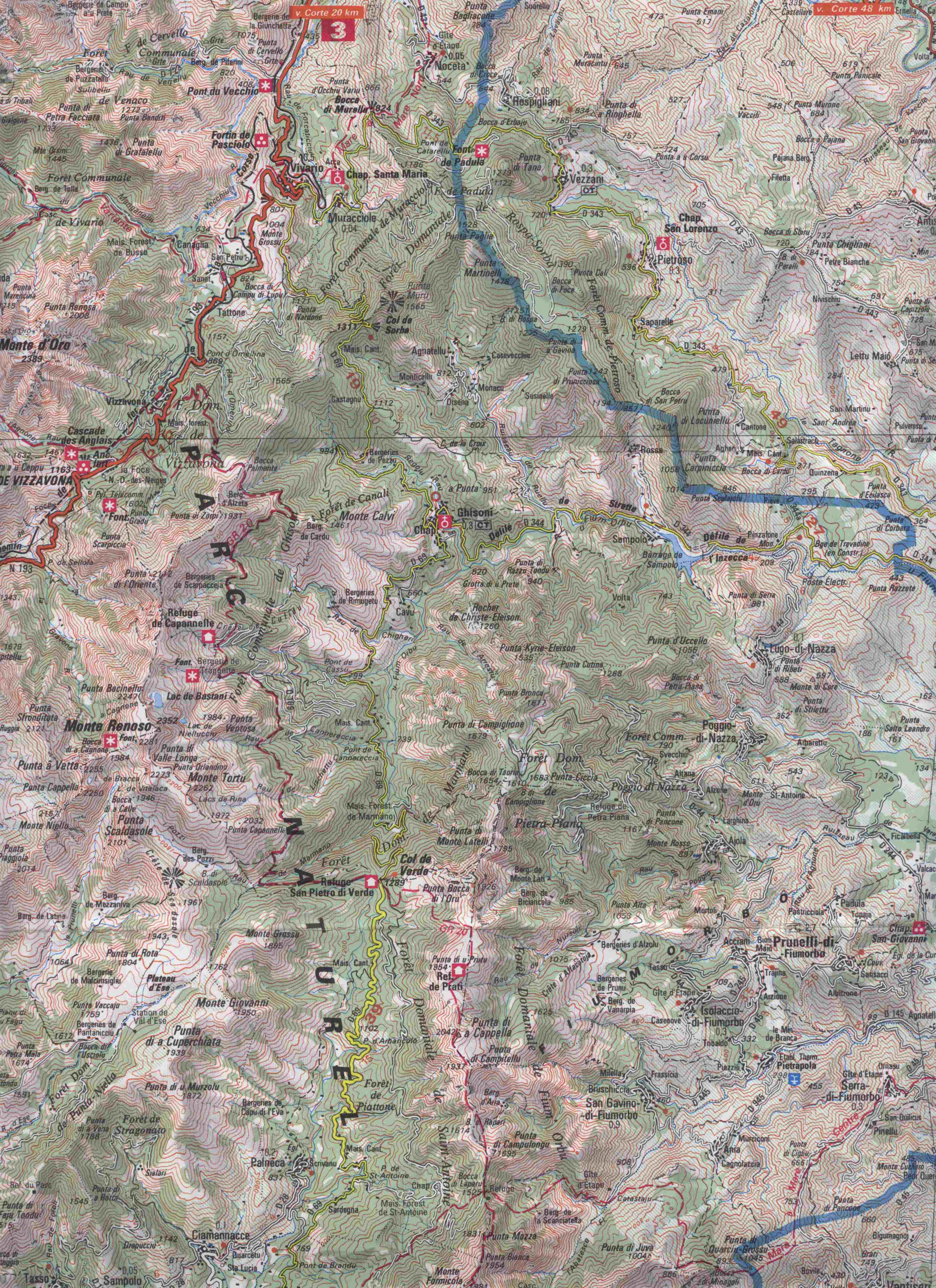 En illustration de ma présentation, je vous joins les cartes du parcours : une carte générale du GR20 (Corse GR20.jpg) et sur deux morceaux, le détail avec les cotes de niveaux du GR20 Sud de Vizzavona à Prati (Korsika ajaccio Bonifacio-04.jpg) et de Prati à Bavella (Korsika ajaccio Bonifacio-09.jpg). Un rapide zoom avec votre navigateur vous permettra de prendre la mesure de l'itinéraire.
