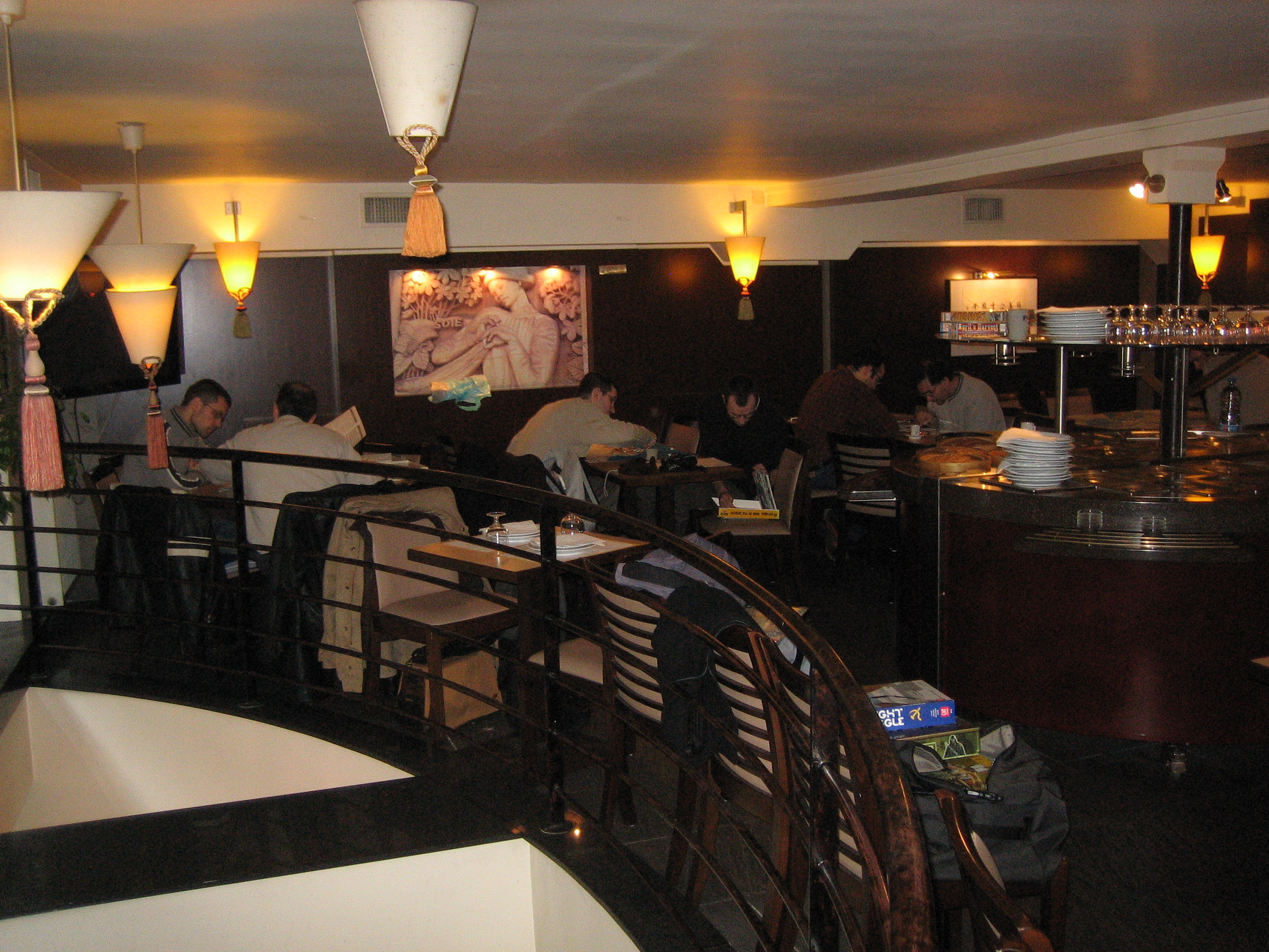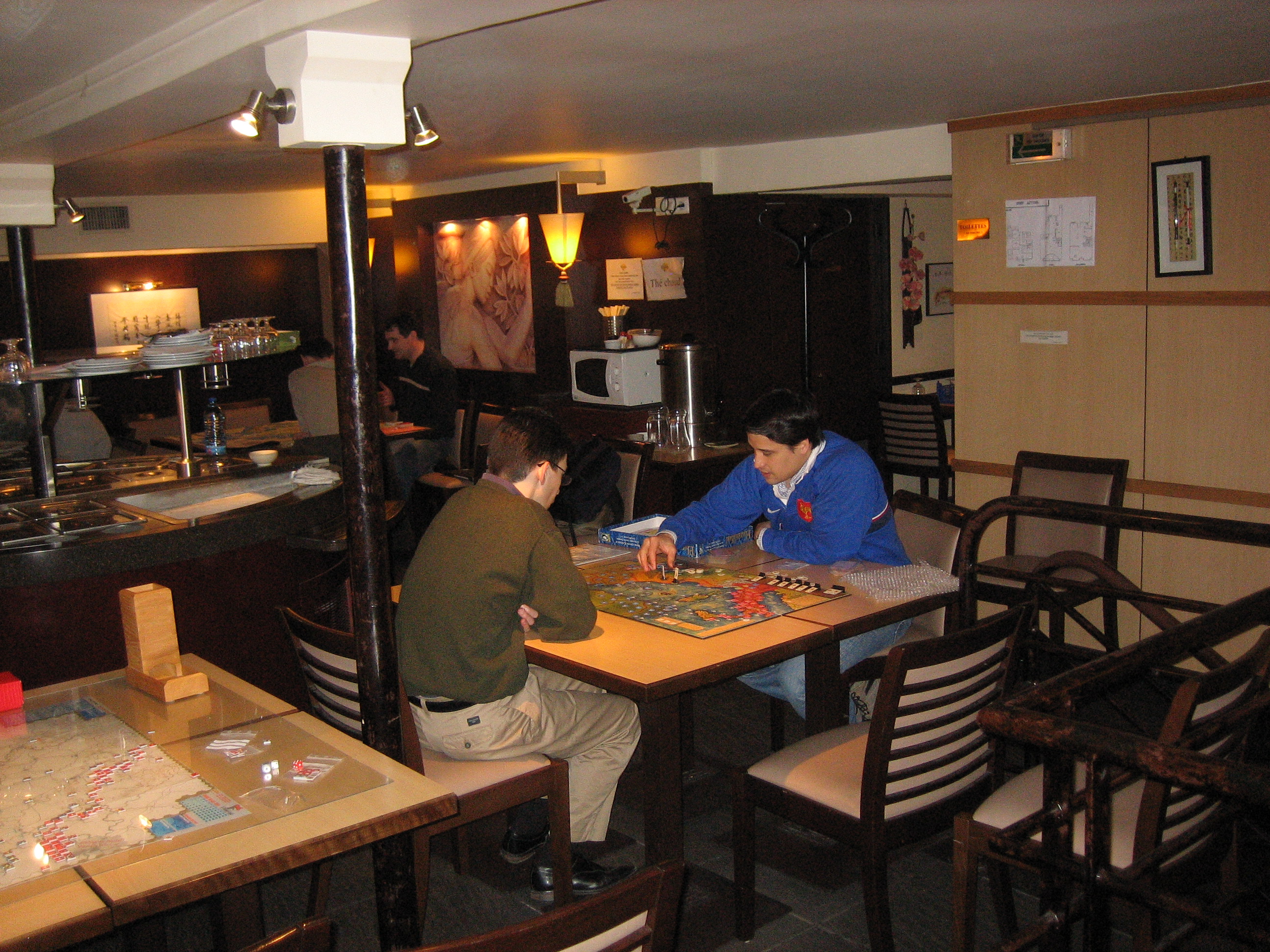 Photo 1: Vous voyez le décor du restau on avait pour nous tout le 3e étage. Habillé en bleu c'est l'organisateur de la journée il perpare une partie de Hannibal en jeu édité en Francais par descartes et que Florian semble connaitre...