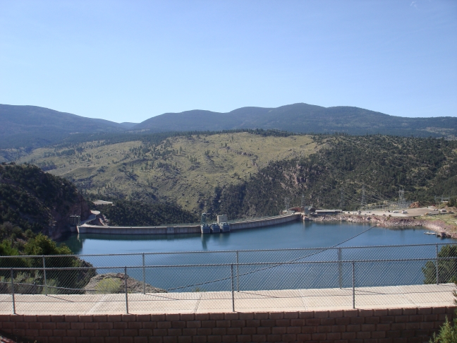en comptant les arrêts ).Le programme d'aujourd'hui, le Grand Teton NP et le Yellowstone où nous logerons 2 nuits, un des autres points forts du parcours, puisqu'il est fort réputé également. On décide donc de partir vers 8h du matin pour pouvoir encore faire un tour dans le dernier parc. Photo 1 : En quittant Vernal, on dit au revoir au dernier dinosaure (Denver ? ), je le trouvais sympa.Photo 2 : Cette fois-ci plus de ligne droite, c'est valloné et ça tourne... Les paysages qui se sont considérablement verdi depuis les déserts restent somptueux. Photo 3 : Sur la route, on traverse un barage, on décide de s'arrêter un peu plus haut pour prendre quelques photos, en Belgique, on n'a pas de barrage digne de ce nom Photo 4 : Une vue du réservoir du barrage. En fait, le lac s'étale en longueur mais comme nous n'étions pas en hélico, c'est difficile à faire percevoir. Photo 5 : Et comme d'habitude, le petit panneau explicatif ou de données concernant le lieux. Il est par contre rare qu'ils indiquent les mesures européennes, je vous les donne donc. Photo 6 : Vers 14h, on arrive à Jackson, une ville qui garde un certain cachet de l'ouest... Photo 7 : Cela aurait presque pû être un Saloon de l'ancien temps Photo 8 : Cette petite ville est "célèbre" pour avoir la plus grand arche du monde en bois de cerf, d'où la photo. A suivre le Grand Teton National Park, qui fera plaisir au français et aux obsédés
