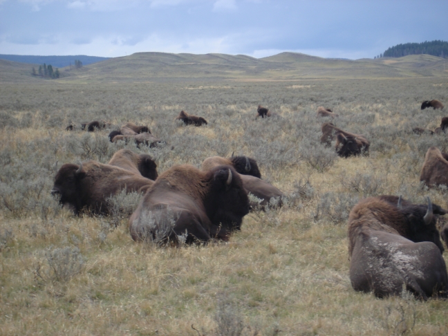 Donc je disais, pleins de bisons... Plus de 4000 dans le parc, et on en voit partout... Des solitaires, des grands troupeaux, des qui bloquent la route, des qui vous regardent mechamment...