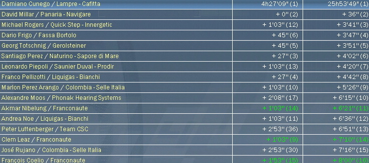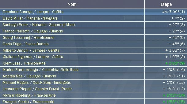 - Bien que les étapes de haute montagne ne me conviennent pas vraiment, celle-ci ne me désavantageait pas tout à fait puisqu’il n’y avait qu’une seule ascension d’envergure que j’ai ma foi fort bien négocié - C’est plutôt toute cette première semaine de course que vous avez bien négocié puisque vous vous retrouvez maintenant à la 16ème place au général - Certes c’est un peu inespéré ! Chaque jour j’essaie de donner le meilleur de moi-même et surtout je tiens autant que possible à terminer devant Akmar. Comme ses résultats sont excellents, les miens s’en ressentent - Ce qui est étonnant quand on regarde le top 20 de ce Giro, on remarque que vous êtes un des seuls à rester discrètement au sein du peloton … - Oui, mais ça paye et puis vous oubliez le final de la 7ème étape . C’est bien aussi de voir que la régularité paye. Par ailleurs, il y a une chose dont je suis très fier, c’est de ma place de premier français.- Merci Coelio légende des images ; Topo de l’étape 8, classement de l’étape et classement général à l’issue de celle-ci