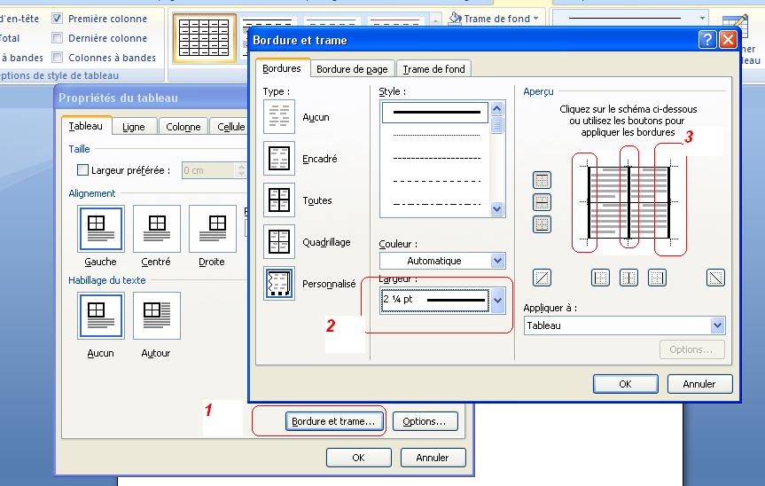 ATTENTION l'explication suivante a été réalisé sous WORD 2007 et non pas 2003 mais le principe doit être identique Image 1 : construit un tableau, sélectionne-le puis fait afficher ses propriétés. ![]() ![]() Uploaded with ImageShack.us Image 2 : Cela risuq ed'être légèrement different sous 2003. Tu recherche "bordure et trame...".(point 1) Dans "Bordure", tu sélectionnes une largeur (=épaisseur du trait) plus importante, exemple "4" (point 2) Puis, sur la droite, tu cliques sur les lignes qui t'interesse dans le schéma (point 3). je repête, tu clique uniquement sur les lignes qui t'interesse, (regarde le point 3) ![]() ![]() Uploaded with ImageShack.us Image 3 : On obtient alors un tableau avec des lignes verticales bien plus épaisses que celles horizontales. ![]() ![]() ![]() Uploaded with ImageShack.us Voili, voilou