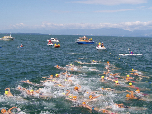 Nous arrivons à Thonon, les premiers nageurs, ceux du 1500m sont déjà à l'eau. Ce 1500, je l'aurai bien fait mais il était réservé aux nageurs licenciés et les "amateurs" comme moi n'avons le droit qu'à la course promotionnelle de 600m
