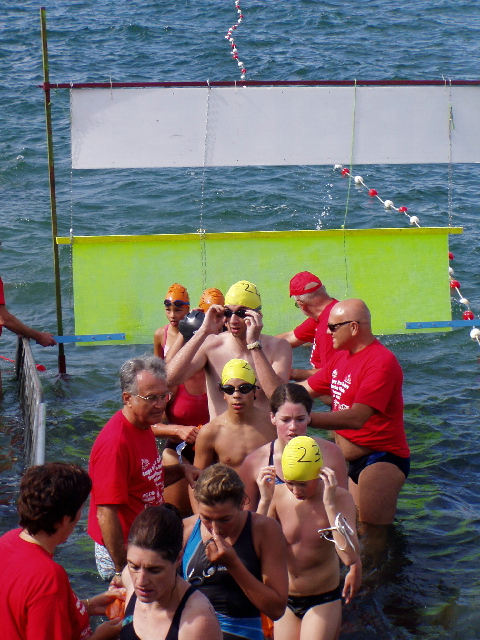 Les 67 nageurs s'installent le long de la ligne de départ. Un certain nombre s'agglutinent même les uns sur les autres. Au contraire, je choisis de me mettre un peu à l'écart, plus "au large" pour ne pas être trop gêner et ne pas prendre trop de coups.