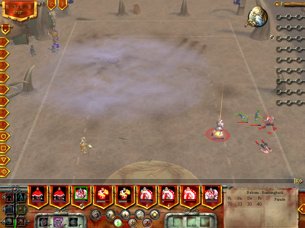 les Tyrans de Franconaute Pour le moment, ils ne sont qu'en division 3 mais ils rêvent de tutoyer les sommets. Moins rapides que des elfes, moins féroces que des barbares ou des nains, ce ne sont que des humains mais s'ils n'ont pas de véritables points forts, ils n'ont pas non plus de points faibles. Hormis les deux receveurs Yboom et Pumba, chacun des joueurs est capable d'arrêter un porteur de balle et tous, linemen compris, peuvent aller dans l'en-but adverse. Pour cette première saison, l'objectif sera avant tout de glaner de l'expérience et de progresser en sauvagerie pour les linemen et les runningback, en dextérité pour les QB et les receveurs, en vitesse pour les receveurs et les RB et en protection pour les linemen et les QB. L'autre objectif sera de faire du chiffre pour pouvoir attirer Schnick dans notre équipe et à l'heure qu'il est, il manque 200 000 dans les caisses pour cela. Une fois ceci accompli, ce sera du bonus que de jouer les tout premiers rôles et de pouvoir accéder au barrage Toutefois, je ne me contenterai pas d'une cinquième place par exemple mais il y a quand même une différence entre cette cinquième place et une première qui qualifie pour la finale. Que le festival commence
