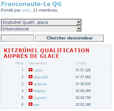 Pas de gros changement au niveau classement par rapport à hier (en fait même aucun). Tout le monde reste sous la couette et garde des forces pour la compet de ce week end.Chacun a visiblement trouvé des réglages qui leur conviennent. Allez encore quelques tests avant le grand jour !! notamment pour rester au dessus des 100 km/h sur le grand plat dans la partie haute de la piste (perso, je n'y arrive pas). Bonne journée à tous Palantix (pigiste de l'Echo des Cîmes).