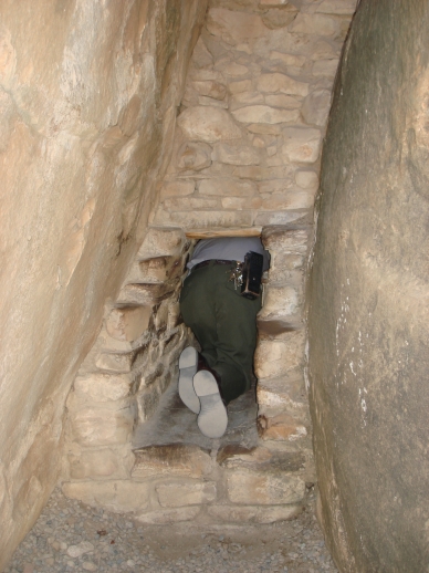 En fait, le site est divisé en deux parties divisée par un mur. Dans la première partie semblent être les réserves de bouffe et de matériel liturgiques. Photo 1 : La première partie. Photo 2 : Pour passer à la seconde partie, il faut de nouveau se faufiler par un trou de souris. Photo 3 : Contrairement aux constructions que vous avez vu sur la première photo, je vous présente leur maison. C'est dans ce trou qu'ils vivaient par famille. Le trou qu'on voit en bas à gauche sert à faire entre l'air pour alimenter le feu et ne pas étouffer là-dedans, il est orienté en fonction des vents dominents de l'endroit. Il faut aussi se dire que cette structure était recouverte de branchages pour protéger du froid et du chaud. Photo 4 : De nouveau, cela ressemble à une habitation mais ce n'en est pas une. Quand on regarde à l'intérieur, on remarque que les murs sont pleins de suie. Les scientifiques pensent que sont en fait des gigantesques "citrouilles d'Halloween" destinés à faire peur aux habitants des pleines en face pour qu'ils ne viennent pas s'aventurer ici. On peut remarque que les fenêtres donne l'impression d'avoir 2 yeux et un nez. Photo 5 : Un dernier petit, tout petit passage, unique moyen de sortir dans ce sens-là. C'est à cause de cela que les obèses ne peuvent descendre... Photo 6 : Et on remonte, la visite est terminée PS: J'explique ce dont je me souviens et qui me semble amusant ou intéressant, si vous voulez plus, moins ou autre chose, les questions et commentaires sont les bienvenus, hein