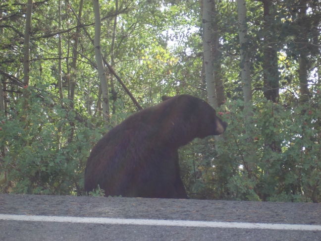 .Photo 2 : Allez-vous reconnaître de quelle montagne le parc tire-t-il son nom ? Photo 3 : Le Grand Téton de plus près Photo 4 : Ce parc est très vert et est une énorme réserve naturelle pour la faune et la flaure, les "Bear Warning" fleurissent partout, pas très "warné", nous espérons en voir un car c'est très rare malgré leur nombre relativement élevé.... Pour illustrer mes propos, une jolie rivière que nous traversons (La "Cottonwood creek"). Photo 5 & 6 : Chance extraordinaire , un ours surgit sur le bord de la route et commence à déguster un buisson de baies juste de vant nous... Nous avons pu l'observer à loisir et prendre de belle photo. Comme je disais, malgré leur nombre, peu en voit réellement et malgré le temps qu'on a passé dans le parc, c'est le seul que nous verrons.La suite au Yellowstone, le plus riche parc, le plus ancien et le plus grand des Etats-Unis où nous passerons 2 nuits
