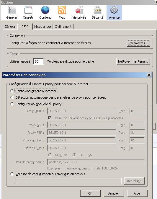 Moi au taf je dois connaître le port et le proxy pour pouvoir surfer avec le laptop. Pour paramètrer firefox suit ceci: 1-Dans la barre des menus, clique sur Outils et ensuite sur Options. 2-Clique sur l'option Avancé. 3-Clique sur l'onglet Réseau. 4-Dans la section Connexion, clique sur le bouton Paramètres... |
