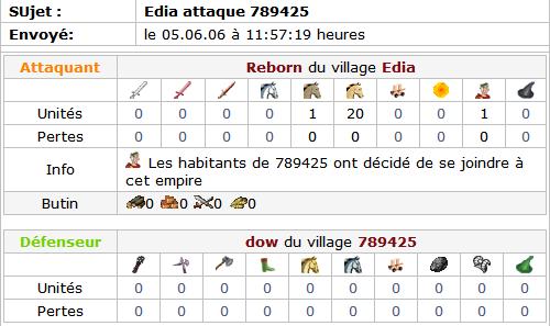 Avec mon conseiller-stratège, nous avons lancé des vagues d'eclaireurs sur toute la région, mais notre choix se reposa sur un village, un seul et unique pour le moment, où toutes nos attaques se concentreraient, s'uniraient pour enfin voir un autre peuple se joindrent à nous ! Après de multiples catapultage, des batailles acharnées, et une assistance énnemie désorganisé... le village fut notre.. Ajourd'hui, j'ais décidé que mes hommes le méritaient... L'hydromel, les femmes, (les hommes pour certains) sont à mes frais. Ils m'ont aidé a gagner cette bataille, cependant la guerre ne fait que commencer... DeAmOnS Général des armées de Reborn __________________________________________________ ___________ Donc voila, sympathique, un nouveau village les Glad sont vraiment désorganisé, j'ais détruit 2 assistances, et maintenant que le village est a moi, il reste encore des assistances qui arrivent, (je vais transferer avec le marché les céréales, si jamais le village passe en négatif en prod... Ciao les assistances ^^ ) Mais maintenant j'aurais besoin de votre aide :D pour détruire totalement à la catapulte, les villages suivant : 1565478 et Nouveau village (-55;44) Le joueur Dow ne réagit plus, je pense qu'il a abandonné le jeu, et j'ais besoin de rayer de la carte ces villages pour pouvoir en coloniser d'autres depuis ce village Donc si quelqu'un veut bien lancer ces catapultes ! Donnez mois leurs heures d'arrivées, et je veillerais a lancer des Impérians pour raser le peu de défense (que je rase toutes les 3heures, pour mes propres catas) pour vous éviter de malheureuses pertes !!! ![]() Merci à tous d'avoir lu, et bonne journée ! EDIT : je suis passé au classement, de la place 280 à 142. Reborn Francon 3899 7
