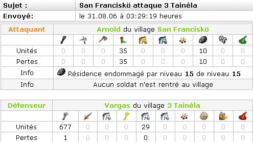 Voila il y a une semaine, (+-) j'ai pris un village, a chewbi en -82/137 de l'ally GEN. Le gars a décidé d'arreter travian,(il ne m'a opposer qu'une faible resistance) Mais ses petits copains recupèrent ses village et se sont mis en tête de prendre mon nouveau aussi. Arnold des GEN à commencer l'offensive (il a 2 village voisin au miens).