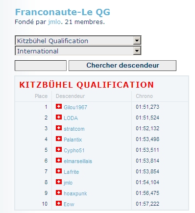 Nous entamons la dernière ligne droite de qualifications, c'est le moment ou jamais de se donner à fond pour être parfait lors de la course du week-end. Justemement le week-end ne fût, semble-t-il, pas très actif. Peu d'évolution dans le classement et dans les temps. La piste est certes technique mais de là a constater que les chronos ne bougent pas est inquiétant pour la descente. Restons toutefois optimiste de voir d'ici vendredi quelques évolutions majeures, surtout sur piste verglassé ou la plupart des franconautes n'a pas encore établi de chrono. La rédaction remercie les nombreux lecteurs de leurs marques soutien à notre rédacteur en chef, à l'occasion de la petite épreuve de santé qui se dresse devant lui.