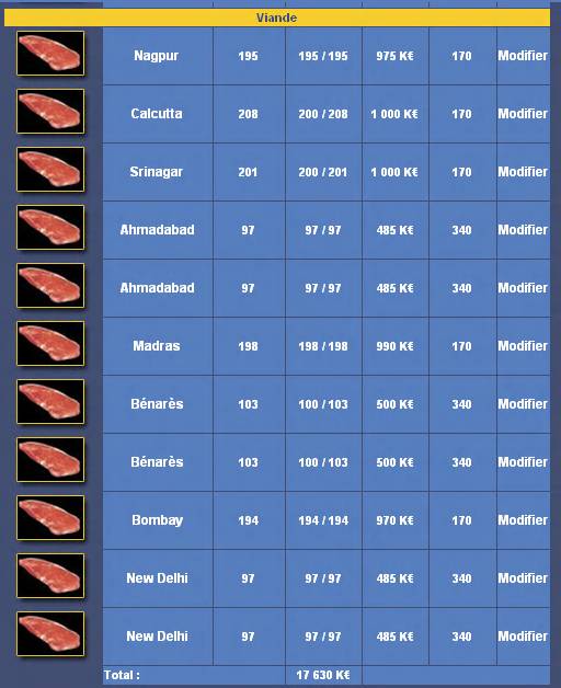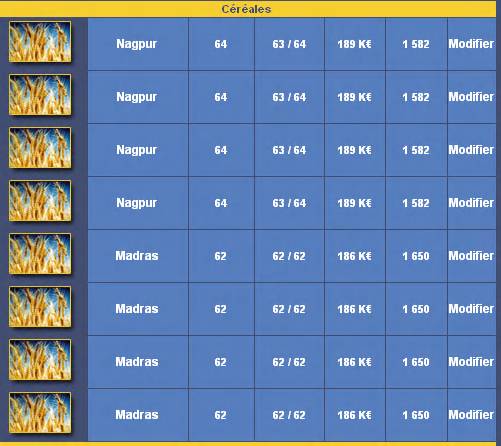 Céréales et thé deux territoires qui peuvent produire seulement (Madras et Nagpur). Arachide, cacao, café et sucre que 4 territoires qui peuvent produire. Et je ne parle même pas ici des limites de production puisque mes 2 territoires qui peuvent produire du thé par exemple ne m'en donnerait que 100 en tout. Pour les céréales 500 à condition de toujours pouvoir produire au maximum. Cela me donnerait moins que ce que je peux produire aujourd'hui avec ces foutus règles