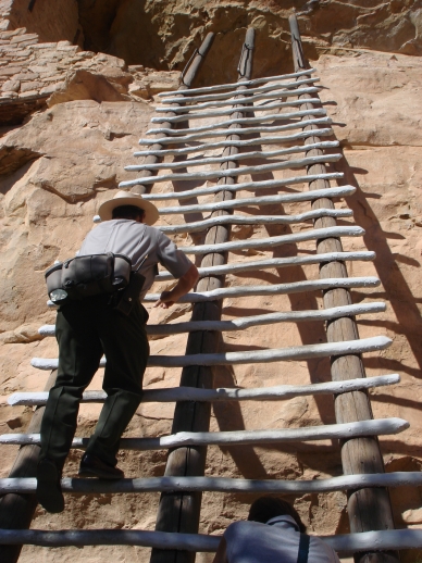 Photo 5 : On remonte l'échelle pour arriver au site proprement dit, devant nous, notre ami le Ranger. Très clair dans ses explications et il a le bon goût de nous expliquer que leur connaissances sur les indiens qui ont vécu là sont sommaires car pas d'écriture et les descendants ont perdu les traditions. On en est donc réduit on conjecture et il nous propose à chaque fois les différentes théories. Respect pour cette honnêteté. Je connais des guides qui aurait juste déballé la théorie dans laquelles ils croient et puis basta. Comme je le disais tous les rangers rencontrés sont vraiment des passionnés de nature et d'histoire et sont souvent nommé à un endroit d'après leur aptitude et leur intérêt personnel dans les sites du parc.