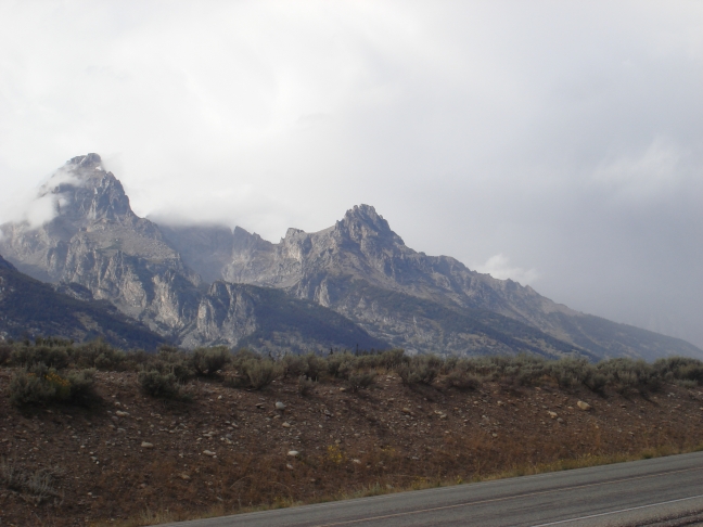 Photo 1 : Une demi-heure après avoir quitter Jackson, nous entrons dans le Grand Teton National Park. En fait, cette région a été "découverte par des explorateurs français, ils ont donc nommé donc les environs selon leur vocabulaire en français et comme une des montagnes ressemblait de leur point de vue à une demi poitrine de femme, ils ont appelé cette montagne le Grand Téton... D'autres lieux-dits et rivières portent encore le nom français dorénavant prononcé avec un excquis accent américain