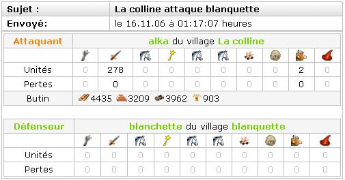 Enfin Helfima fait partie des co-responsables : il m'a pris un village (un 9c très bien développé) : donc s'il était vraiment solidaire avec Blanchette il assumerait sa propre responsabilité en donnant à blanchette le village qu'il m'a pris. Comme ça nous reviendrons à la situation de départ et blanchette n'auras rien perdu (les quelques armées que je lui ai détruites ne sont rien en comparaison de celles que j'ai perdu lors de la prise de mon principal 9c par Helfima).