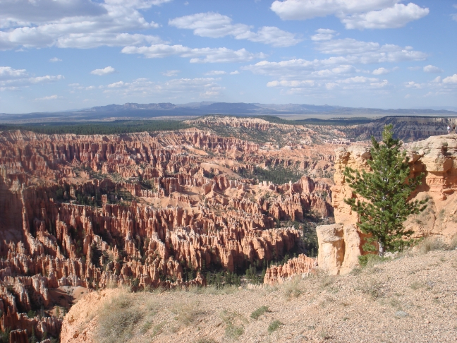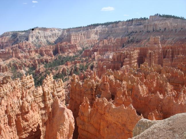 En fait, le canyon était un bassin qui était parcourue par toutes les eaux de pluie de la région, à force de vent et d'eau, l'érosion a taillé dans la pierre des formes magiques et de toutes les couleurs... Nous avons fait le soir la Rim Trim, c'est à dire la ballade circulaire le long de la falaise sur la crête. C'est une longue ballade relativement escarpée et sous un soleil de plomb mais la vue en valait l'effort... Seule petite crainte, tomber sur un grizzly en ballade (Les panneaux d'avertissements sont de nouveau partout) mais heureusement nous n'en avons pas vu. Photo 1 : L'arrivée sur le bord du canyon est à couper le souffle... J'ai mis un petit point noir pour vous indiquer la destination de la ballade que nous avons faite le long de la crête... Photo 2 & 3 & 4 : Des vues le long de la crète... Photo 5 : Arrivée à notre destination, une vue de ce qu'il y a après le canyon... Photo 6 : La seule faune que nous avons vu dans les environs, un vautour, ce qui est excessivement rassurant vu qu'ils se nourissent de carcasses et que nous avons relativement chaud.... ![]() PS 1 : J'ai plus de photos, je peux en mettre si vous le voulez. PS 2 : Vu la beauté des paysages, j'ai un peu moins diminuer la taille des photos, j'espère que cela n'handicape pas vos pages.