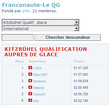 Nous entamons la dernière ligne droite de qualifications, c'est le moment ou jamais de se donner à fond pour être parfait lors de la course du week-end. Justemement le week-end ne fût, semble-t-il, pas très actif. Peu d'évolution dans le classement et dans les temps. La piste est certes technique mais de là a constater que les chronos ne bougent pas est inquiétant pour la descente. Restons toutefois optimiste de voir d'ici vendredi quelques évolutions majeures, surtout sur piste verglassé ou la plupart des franconautes n'a pas encore établi de chrono. La rédaction remercie les nombreux lecteurs de leurs marques soutien à notre rédacteur en chef, à l'occasion de la petite épreuve de santé qui se dresse devant lui.