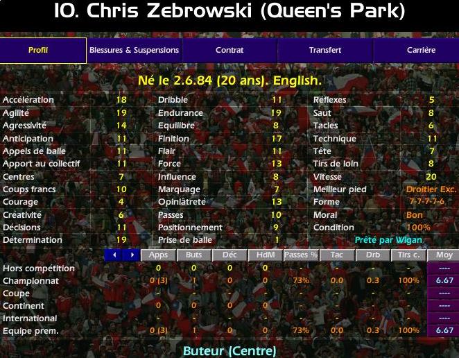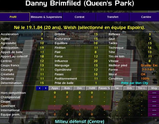 Et une nouvelle fois entraîneur du mois Et cette fois-ci c'est Johnson, mon latéral gauche qui est meilleur jeune ![]() [TABLE][TD]Flash info : la France remporte les Jeux Olympiques 2-0 face à la Grèce . L'argentine finie 3ème en battant l'Allemagne 1-0 (vous noterez que les JO sont en octobre maintenant )[/TD] [/TABLE] Match passionant, nous recevrons tout simplement le Celtic Franchement j'ai bon espoir de réaliser une belle prestation ... même si une petite branlée me ferait en fait plus plaisir, j'aime pas vraiment enchaîner les victoires alors que je devrais logiquement être en train de galérer En tout cas de leur côté Van der Vaart (international hollandais, très bon joueur, milieu offensif/attaquant) est blessé, ca devrais nous aider (mais ils le font jouer quand même )![]() 1ère mi-temps : le Celtic met très vite la pression, emmené par un Van der Vaart très en forme pour un blessé Mais malgré eux c'est nous qui allons ouvrir la marque à la 14' à la suite d'une belle réalisation collective . Le Celtic pousse toujours, mais à la 28' nous partons rapidement en contre, et 2-0 Le Celtic n'est pas du genre à se laisser abattre 33' tir surpuissante qui frôle la transversale . 38' frappe surpuissante de Ji-Sung Park, Crawford parvient de justesse à renvoyer la balle, la défense se dégage en catastrophe comme elle peu . Le Celtic mène clairement le jeu comme jamais ... il n'y a qu'à voir les screens, Crawford est impérial dans ses cages .![]() ![]() 2ème mi-temps : grâce à un coup franc nous tuons le match dès la 49', 3-0 . Celtic réagit, et marque à la 60' un mince espoir, mais l'arbitre refuse le but . a partir de là ils ne se montreront plus menacants, complètement démoralisés . Nous avons maintenant 3 points d'avance au classement ![]() ![]() Match à domicile contre St Mirren, une équipe de milieu de tableau . ![]() 1ère mi-temps : l'adversaire en veut, c'est le moins que l'on puisse dire ... ils ouvrent la marque dès la 2' 6' frappe de loin, Crawford parvient à claquer le ballon du bout des doigts . 13' 2-0 ! Mais l'arbitre refuse, ouf . Alors que l'adversaire est le seul à se créer des occasions, nous avons notre première à la 23' ... égalisation ! 28' le gardien adverse claque le ballon cadré du bout des doigts . 37' il dévie encore de justesse . Le gardien qui réalise un gros match (note de 9) 2ème mi-temps : tout reste à faire :phrase inutile mais qui fait bien: . St Mirren nous fait le même coup qu'au début ... 2-1 à la 50' mais pas question de rester les bras croisés cette fois-ci, égalisation à la 51' . Aggravation de la marque 3-2 pour nous à la 65', ca semble bien parti . L'adversaire a beau pousser, mais ils se prennent bêtement un but en contre à la 85' 4-2, le match est plié . ![]() Que 2 jours de repos et encore un match, contre Livingston cette fois-ci, 8ème . Les matchs sont beaucoup plus ressérés que durant les saisons précédentes ![]() Première mi-temps chiante comme la pluie comme diraient certains ... une poignée d'occasions ... mais ca ne nous a pas empêché de mener 2-0 . Deuxième période, ca commence de la même façon, mais coup de théâtre à la 56' McGoldrick, mon milieu défensif est expulsé ! Le problème c'est que le milieu défensif est vraiment l'élément le plus important ... mais la facon dont on menait le match je laisse tel quel ... énorme erreur . L'adversaire se sent subitement pousser des ailes et va faire tout le travail désormais . 65' 2-1 ! 67 2-2 ! 78' 3-2 ! heureusement l'arbitre refuse le dernier, Livingston enchaîne les occasions . Je dois me rendre à l'évidence et je remplace un milieu offensif pour placer 3 défenseurs . Ca a réussit, on en restera à 2-2 . On a évité une sévère déroute Merci monsieur l'arbitre qui nous accorde un pénalty et refuse un but pour l'adversaire :a maintenant un peu d'argent pour corrompre:Bref ca a l'avantage de me faire perdre 2 points bêtement et de relancer un peu le championnat . C'est pas du luxe ![]() ![]() Départ de McGoldrick qui a été acheté par Dundee Du coup je cherche un autre milieu défensif pour épauler Hamilton que je trouve en Brimfiled, jeune espoir gallois . Il sera remplacant seulement, bien que sensiblement de compétence égale avec Hamilton . Ce dernier réalise une superbe saison avec 9 matchs, 6 passes décisives, 1 fois homme du match et une moyenne de 8.29 (autrement dit : meilleur joueur du championnat )![]() Vous pouvez en profiter pour remarquer que l'on a pas mal de buteurs ![]() ![]() Et aussi voir que je suis toujours semi professionel :n'arrive pas à passer pro: :comprend pas pourquoi:![]() Et on en revient au point de départ : nous affrontons à nouveau Dundee United contre qui nous avions concédés un nul précédément . ![]() 1ère mi-temps : 5' première balle de Brimfield, petite passe dans la surface pour Kennedy ... BUUUT ! Brimfield qui commence bien chez nous . Nous allons dominer les 10 prochaines minutes quand petit à petit Dundee reprend le dessus . 24' tir et transversale ! La balle retombe sur un attaquant qui tire et ... BUT ! 1-1 . 34' ils font entrer McGoldrick qu'ils nous ont piqués il y a quelques jours Domination totale de Dundee mais qui n'arrive tout de même pas à concrétiser ... 2ème mi-temps : nous sommes toujours pressé, 53' triple changement de mon côté, oui je suis un fou, vous avez un problème ? Ils apportent de la fraîcheur à l'équipe qui arrive enfin à sortir de sa moitié de terrain . Les occasions se suivent mais sont rarement cadrées . 73' tir de Tudgay ... transversale ! 82' ballon récupéré on ne sait comment par Gough dans la surface en demi volée ... BUUUUUT . 2-1 pour nous . Dundee réagira mais il est bien trop tard . Petite victoire donc dans un match où nous ne le méritions pas vraiment ![]() ![]() Match contre Kilmarnock, 9ème . Nous les avons écrasés 6-2 la dernière fois, un record à ce moment là ... ce s