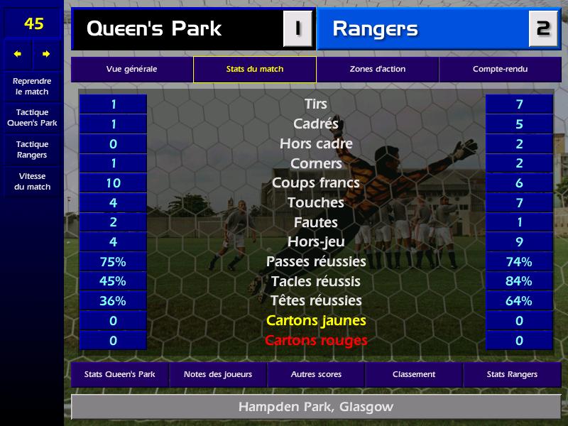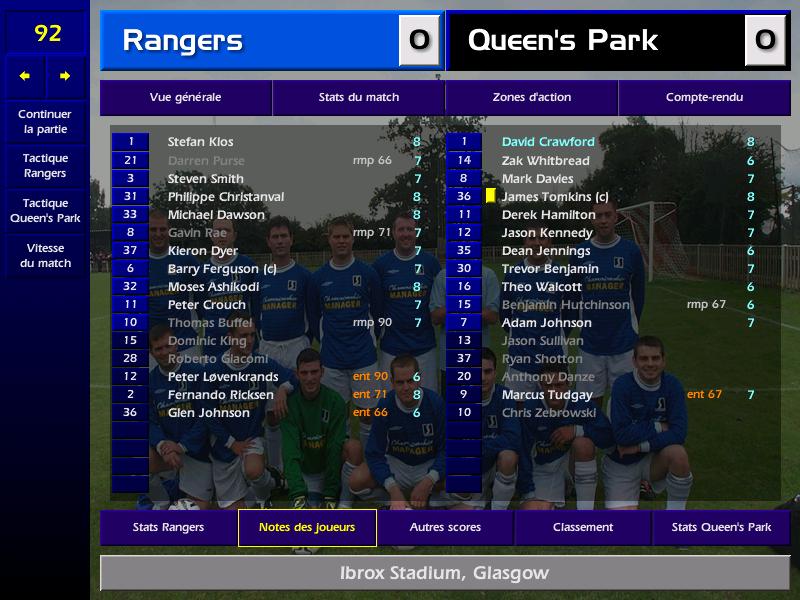 Et encore entraîneur du mois Au niveau des finances : tout va bien ca monte tout le temps ... ca monte peu mais ca monte . En fait le principal problème du club est l'affluence ... on a un stade de 50.000 places mais dont l'affluence est largement bridée par le jeu En gros je ne peux espérer avoir un stade bien remplit que lors des demi finales/finales de coupe et match européens ... et encore . La moyenne de spectateurs par match est d'environ 9000 ... alors que d'autres équipes qui ont par exemple un stade de 20.000 places sont toujours remplis à ras bord Modifications dans l'équipe : - en défense je place Bristow titulaire et place désormais Whitbread sur le banc . Ce dernier n'est pas forcément mauvais en ce moment, mais n'est pas exceptionnel, ca me permettra de comparer avec Bristow . - au milieu droit Glatt est titularisé aux dépends de Harper dont les performances actuelles ne sont pas flamboyantes . - au milieu offensif pas encore de changement mais je ne suis pas très ravi des derniers matchs des deux titulaires, peut être quelques modifications à venir . Mais j'ai une marge de manoeuvre ultra réduite dans le secteur ![]() - Hutchinson est remplacé par Gough . Espérons qu'il saura se montrer à la hauteur face à un Hutchinson qui totalise quand même deja 12 buts en 15 matchs ... sauf qu'il n'a plus marqué depuis longtemps ![]() Match contre Aberdeen, 5ème . Une équipe battue 5-2 mais dont il faudra se méfier, ils sont dans une bonne "série" . ![]() 1ère mi-temps : début de match équilibré, action dangereuse en faveur d'Aberdeen à la 18' l'attaquant adverse remonte tout le terrain avec le ballon éliminant mes joueurs les uns après les autres ... devant le but il frappe ... poteau ! Le ballon revient sur un de ses camarades qui tire un boulet de canon ... crawford dévie le ballon du bout des doigts . 20' Glatt centre sur Davies qui reprend de volée et BUT ! 1-0 pour Queen's Park . Crawford va encore subir des frappes qu'il repoussera avec difficulté, mais qu'il repoussera . Grâce à ca il aura tout de même une note de 9 à la pause . Comme vous pouvez le voir nous sommes dominés, mais rien d'irrémédiable ... surtout quand on mène au score ![]() ![]() ![]() 2ème mi-temps : Aberdeen ne s'endort pas, 50' tir de loin qui tape la transversale . 74' même tireur, même situation ... la balle effleure la transversale ! Ils manquent de peu de mener au score depuis le début du match 80' poteau ! Le temps presse et Aberdeen ne pourra au mieux que se contenter d'un nul ... mais ils perdent le ballon à la 92' et la contre attaque aboutie, score final 2-0 . Troisième match où l'en s'en sort miraculeusement bien . En tout cas c'est mieux que des 5-0 à la chaîne qui sont bien beau ... mais à force c'est lassant .![]() Mauvaise nouvelle : Glatt termine sa période de prêt ... et son club, le Galatasaray refuse de le prêter à nouveau ... ils ont dûs comprendre l'erreur qu'ils ont fait de se séparer d'un joueur comme lui Harper reprendra du service en attendant de trouver mieux si possible .Match contre Hearts, équipe mal classée (11ème) mais difficile à manoeuvrer . ![]() 1ère mi-temps : nous prenons très vite le jeu à notre compte, but à la 10' . 24' première occasion pour Hearts : 1-1 . 34' 2-1 pour nous Quasiment toutes les occasions sont pour nous .2ème mi-temps : 54' nous tuons le match, 3-1 . Vu se que Hearts nous a montré jusqu'à présent : aucune chance qu'ils reviennent . Pourtant il nous font douter à la 77' en réduisant le score, mais cela ne sufira pas, ils ne se créeent quasiment pas d'occasions . ![]() ![]() ![]() Nous recevons les Rangers, enfin un match intéréssant . Ils ont 4 points de retard sur nous, mais aussi un match de retard . Autrement dit on a virtuellement qu'un point d'avance sur eux, en cas de défaite ca relance un peu le suspence ... en cas de victoire beeeeeeen ![]() ![]() 1ère mi-temps : 12' première occasion du match ... Hamilton fait une passe dans la surface pour Gough qui se trouve tout seul ... BUUUUUT ! Ca commence fort Pendant 10 minutes il ne se passe ab-so-lu-ment rien, ca ressemble à un match facile pour nous . Mais voila première occasion pour les Rangers à la 26' et égalisation ! Ils continuent de presser et marquent encore à la 36' sur coup franc . 2-1 pour les Rangers à la pause . Moi ca me dérange pas de me prendre une branlée (tant mieux pour l'intérêt de la partie d'ailleurs) ... tant que Crouch ne marque pas Quoi qu'il en soit première période totalement dominée par les Rangers, nous nous sommes crée qu'une seule et unique occasion .![]() 2ème mi-temps : les Rangers semblent se contenter de vouloir tenir le score, nous avons la maîtrise du jeu . Mais les Rangers défendent bien, nous n'arrivont pas à être très dangereux jusque dans les 20 dernières minutes . 73' Cunningham fait une passe de la tête pour Kennedy qui se trouve en position de tir ... c'est cadré ... le gardien semble battu ! BUUUUU non poteau ! Le ballon repart au loin mais est récupéré et renvoyé dans la surface, cette fois-ci c'est Hutchinson qui s'y colle et frappe fort ... BUUUUUUUUUUUUT ! 2-2, les Rangers reprennent seulement à partir de maintenant leurs véléités offensives . Nous allons assister à 15 dernières minutes de folie . Remise en jeu des Rangers ... BUT ! Ha non c'était juste une passe à 60 mètres du but, autant pour moi :fait comme Leboeuf au mondial: Les Rangers se reprennent néanmoins rapidement, 75' Fowler se retrouve seul devant le gardien mais n'est pas idéalement placé, passe en retrait pour Buffel qui profite de son élan pour envoyer un boulet de canon vers les buts ... incroyable arrêt de Crawford ! 81' les Rangers toujours avec Fowler qui recoit une passe transversale, se débarasse du dernier défenseur et tire ! La balle fonce droit dans les filets ... mais Crawford repousse la balle du bout des doigts ! Fowler récupère la balle et tire à no
