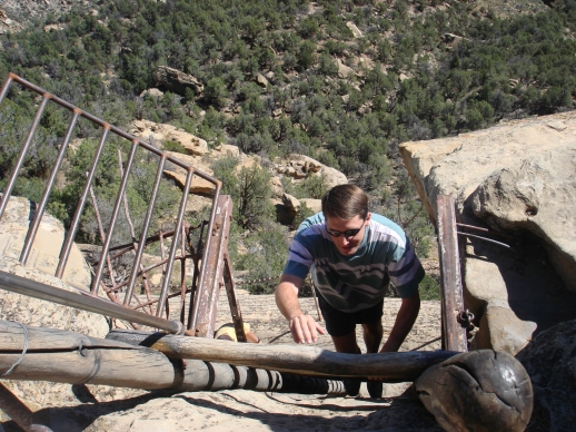 Photo 1 : Quand on traverse le parc, on constate encore des arbres brulés, de nouveau, j'y reviendrai mais sachez que pour ce parc, une année catastrophique (de notre point de vue), 22000 hectares ont brûlés et sur les 20 derniers années quasiment tout le parc à brulé au moins une fois. Photo 2 : Avant de descendre, on peut admirer quelques aigles volant au-dessus de nous, ce sont des aigles chauves m'a-t-on dit, le symbole des USA, une raçe que l'on trouve que en Amérique du Nord. En tout cas, je ne sais pas si on ne les trouve que là mais ils volent vite et sont dur à prendre en photos les bestiaux Photo 3 : Le plan de ce qu'on va faire à flanc de falaise. Des échelles et des sentiers étroits nous attendent. Le Ranger nous prévient, pas de sac à dos, si on est trop gros, on attend en haut car on ne passera pas... Photo 4 : La descente commence... Photo 5 : On remonte l'échelle pour arriver au site proprement dit, devant nous, notre ami le Ranger. Très clair dans ses explications et il a le bon goût de nous expliquer que leur connaissances sur les indiens qui ont vécu là sont sommaires car pas d'écriture et les descendants ont perdu les traditions. On en est donc réduit on conjecture et il nous propose à chaque fois les différentes théories. Respect pour cette honnêteté. Je connais des guides qui aurait juste déballé la théorie dans laquelles ils croient et puis basta. Comme je le disais tous les rangers rencontrés sont vraiment des passionnés de nature et d'histoire et sont souvent nommé à un endroit d'après leur aptitude et leur intérêt personnel dans les sites du parc. Photo 6: Encore un tout petit trou dans lequel on doit passer puis enfin on y sera...